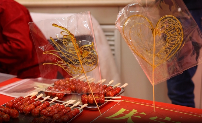 糖画艺人现场制作糖画环节更是吸引了很多人的眼球。只见糖画艺人手法娴熟、用糖稀绘制出了形态各异的糖画作品,引得人们纷纷驻足观看。